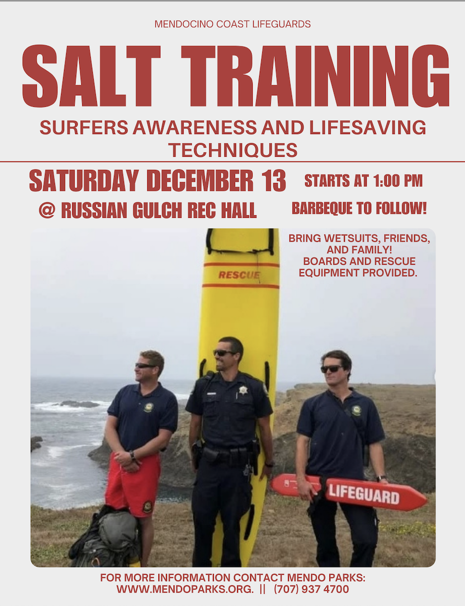 The SALT training (Surfers Awareness and Lifesaving Techniques) teaches surfers how to recognize and react to fellow surfers and swimmers in distress. Hosted by the Mendocino lifeguard program, our goal is to teach the community how to recognize signs of distress, and what to do in an emergency event. We will teach different techniques and strategies to help save lives in the water. Often, first responders in a water rescue event (especially surf-related) are other surfers. We aim to equip the community with skills to make safe and effective rescues. Hosted at the Russian Gulch Rec Hall @ 1 PM. Bring wetsuits, family, and friends! Barbecue to follow!
